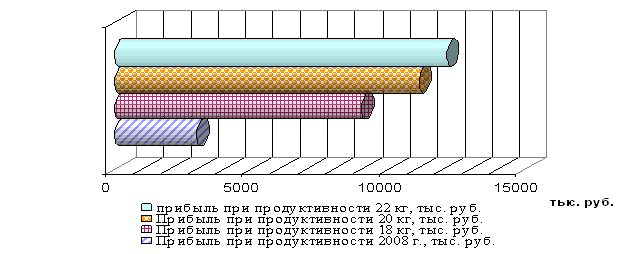 Рис. 11. Сравнение прибыли при различных уровнях продуктивности При существующем уровне товарности в 81% хозяйство реализовало в 2010 году 18235 ц молока и получило прибыль от его реализации в размере 3008,8 тыс. руб. Хотя могло реализовать 22235,5 ц и получить прибыли в размере 11117,25 тыс. руб., то есть недополучило прибыли в размере 8108,45 тыс. руб. Таким образом, ОАО «Базинское» могло бы сэкономить на кормах на 1 голову на сумму 326,58 руб. и получить прибыли всего на 8108,45 тыс. руб. больше при оптимальном рационе кормления животных. Если увеличить содержание в рационе кормовых единиц на 1 кг, то рацион подорожает на 5,04 руб., если увеличить обмен энергии на 1 МДЖ, рацион подорожает на 0,33 руб., так же если увеличит содержание фосфора на 1 г , рацион подорожает на 0,02 руб., на себестоимость рациона может повлиять увеличения на 1мг содержание каратина на 0,001 руб. Зато увеличение содержание концентратов на 1 кг приведет к снижению себестоимости рациона на 2,20 руб., а также на 0,23 руб., если увеличить содержание рациона увеличить на 1 кг грубых кормов. Заключение Состояние дел в животноводстве в настоящее время оставляет желать лучшего. Поголовье животных из года в год уменьшается. Связано все это с тяжелым положением дел в сельском хозяйстве, с низкими ценами на продукцию сельского хозяйства. Хозяйству необходимо осваивать новые рынки сбыта своей продукции, чтобы получать максимальную прибыль. Нужно повышать продуктивность коров. Повышение продуктивности всегда связано с наличием кормов хорошего качества обеспечением биологически полноценного кормления. Необходимо повышать качество даваемого корма, так как кормовая база многих хозяйств пока не удовлетворяет предъявляемым к ней требованиям, хотя и покрывает потребность сельскохозяйственных животных в питательных веществах в целом, однако баланс остается не выровненным. Рассмотренные теоретические аспекты говорят о необходимости грамотного применения экономико-математических моделей, которые позволят сбалансировать кормовой рацион получить наивысшую продуктивность животных с наименьшими затратами. Проанализировав организационно-экономическую характеристику изучаемого хозяйства можно сделать вывод, что ОАО «Базинское» имеет выгодное географическое и климатическое расположение. Хозяйство имеет достаточное количество земли, из которой почти 90% это сельскохозяйственные площади. Так же можно говорить об эффективном использовании данного ресурса. Наблюдается положительная динамика в использовании основных производственных фондах: рост фондоотдачи, фондообеспеченности, фондовооруженности, энергообеспеченности и энерговооруженности и снижение фондоемкости. Эффективно используются трудовые ресурсы - снижается трудоемкость и повышается производительность труда. За изучаемый период произошло углубление молочной специализации – положительная тенденция. Темпы роста выручки выше темпов роста себестоимости, что позволяет хозяйству получать прибыль. Хотя относительные показатели финансовой устойчивости показывают о зависимости ОАО «Базисного» от заемного капитала, показатели ликвидности это подтверждают. Анализируя экономическую эффективность производства и реализации молока в ОАО «Базинское» можно говорить о росте эффективности и окупаемости данном направлении деятельности хозя