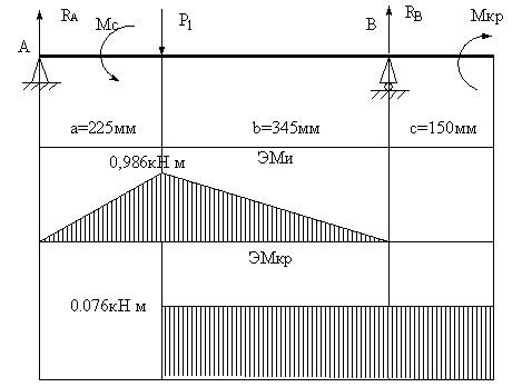 Рисунок 5.4 Эпюры моментов: Уравнение реакций в опорах: åМА=0; Rb(a+b)-P1a=0. (5.16) åМb=0; - RA(a+b)+P1b=0. (5.17) Выражаем и определяем величины реакций: Rb=P1×a/(a+b), (5.18) Ra=P1×b/(a+b), (5.19) где P1 - сила давления сеялки на валы катков, равная половине массы сеялки С3=3,6, равная 7,25кH. Rb=7,25×0,225/(0,225+0,345)=2,86kH. Ra=7,25×0,345/(0,225+0,345)=4,38kH. Приступим к определению диаметра вала опорного катка: