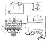 де Є} — подача компресора, м /с; Н — тиск, який розвиває компресор, Па; Рх — початковий тиск газу, Па; Р2 — кінцевий тиск стисненого газу, Па; лк — ККД компресора; г)п — ККД передачі від двигуна до компресора. Режим роботи компресора може бути тривалим і повторно-короткочасним з великою кількістю вмикань за годину залежно від обраної схеми та устаткування для керування роботою установки й двигуна. З урахуванням режиму роботи після підрахунків вибирають електродвигуни найближчої більшої потужності. Електропривід в установках пастеризації молока. Основні режими пастеризації (теплової обробки молока) визначаються технологією його обробки. За умов дотримання технології зберігаються поживні властивості молока без зміни його якості. Недотримання за часом викликає збереження мікрофлори в молоці, перетримання веде до втрати вітамінної цінності молока, карамелізації молочного цукру, змін у білковому складі. У сучасних пастеризаційних установках електропривід використовується для привода молочних і водяних насосів, молокоочисників, які розглянуто у попередніх розділах. Потрібна потужність Р, кВт, на обертання мішалки складається з потужності на подолання опору обертання Рс та потужності на надання кінетичної енергії рідинам Рк, які видаляються з пастеризатора, і дорівнює: