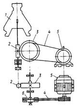Рис. 2. Кінематична схема електропривода сепаратора: 1 — барабан; 2 — черв'як; 3 — шестірня;4 — клинопасова передача; 5 — електродвигун; 6 — відцентрово-фрикційна муфта(або шків) Подача відцентрового насоса залежить від напору та частоти обертання, тому, користуючись напірними характеристиками, можна визначити інші характеристики насоса. Електропривід сепараторів молока. Для виділення молочного жиру з молока використовують сепаратори. Принцип дії сепаратора ґрунтується на здатності механічних сумішей розподілятися у полі дії відцентрових сил за рахунок різної густини сумішей, з яких вони складаються. Розподіл відбувається всередині сепараторного барабана, який обертається з великою частотою, причому щільніші частинки (молочний жир) пересуваються до периферії. Виходячи з технологічного процесу, до електропривода сепаратора висувають жорсткі вимоги відносно частоти обертання барабана. За умови значних коливань швидкості порушується процес сепарування і стає можливим момент, коли вершки будуть відходити до молочник відвійок, а ті, навпаки, зможуть потрапляти до вершків. Тому для привода сепараторів використовують трифазні асинхронні електродвигуни, які мають жорстку механічну характеристику. Незважаючи на різноманітне технологічне призначення молочних сепараторів, конструктивно вони відрізняються тільки будовою барабана. Кінематичну схему електропривода сепаратора наведено на рис. 2. Від електродвигуна 5 обертання через клинопасову передачу 4, відцентрово-фрикційну муфту (або шків) 6, шестірню 3 та черв'як 2 передається барабану 1. Характерним для привода барабана є те, що передаточне число менше за одиницю: