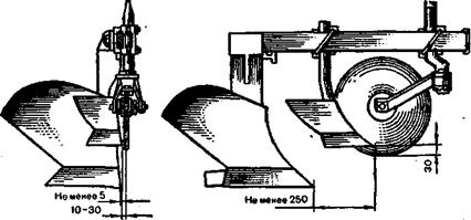 Рис. 3.1. Установка предплужника и дискового ножа С помощью шнура, натянутого от носка первого корпуса к носку заднего, проверяют отклонение носков лемехов основных корпусов и предплужников от прямой линии. Оно должно быть не более 5 мм. Кроме того, у прицепных плугов проверяют установку прицепа. Продольную тягу с раскосом устанавливают так, чтобы тяга была параллельна грядилям плуга, а линия тяги проходила через след центра тяжести плуга, который находится примерно на 5–7 см правее (по ходу) середины линии, соединяющей носки лемехов первого и последнего корпусов. Регулировка в полевых условиях. Перед началом работы для правильной установки плуга в борозде выполняют припашку плуга и его регулировку. В борозде плуг должен идти устойчиво, без перекосов в стороны и по глубине. 4. Техника безопасности и охрана трудаМашины для уборки зерновых культур, трав и других легковоспламеняющихся культур и соломы, а также работающие на молотьбе укомплектовывают исправными искрогасителями и первичными средствами пожаротушения. Движущиеся и вращающиеся части машин ограждают защитными кожухами, обеспечивающими безопасность работы. Запрещается: - устанавливать сиденье на самоходные, навесные и прицепные машины и орудия, где конструкцией это не предусмотрено; - устанавливать вместо стекол прозрачные материалы. Кабины тракторов должны отвечать следующим требованиям: - переднее, заднее и боковые стекла не должны иметь трещин и затемнений, ухудшающих видимость; - боковые стекла при наличии стеклоподъемных механизмов должны легко и плавно опускаться, подниматься и фиксироваться в установленном положении; - замки дверей кабины должны быть исправными, исключающими возможность их самопроизвольного открывания во время движения; - щитки контрольно-измерительных приборов должны быть освещены; - на подушке и спинке сиденья не допускаются провалы, выступающие пружины и острые углы. При наличии на тракторе регулируемого сиденья оно должно надежно фиксироваться в установленном положении (при ремонте или замене сидений и спинок изменять их размеры и формы запрещается); - пол кабины должен быть устлан резиновым ковриком; - в местах прохождения рычагов и педалей должны быть чехлы, предотвращающие проникновение пыли в кабину. Боковые щиты капота двигателя для уменьшения шума от их вибрации должны иметь амортизирующие прокладки. Двигатель не должен иметь течи топлива, масла и воды, пропускать газы в соединениях выхлопного коллектора с двигателем и выхлопной трубой. Лопасти вентилятора окрашивают в цвет, отличающийся от окраски двигателя. В двигателях с воздушным охлаждением воздухозаборное отверстие защищают исправной металлической сеткой. Рычаги механизмов пускового двигателя должны легко и надежно переключаться. Пусковой шнур для ручного запуска должен иметь рукоятку. Техническое состояние электрооборудования должно обеспечивать нормальную работу стартера, приборов освещения, сигнализации и электрических контрольных приборов, а также исключать искрообразование и утечку тока в проводах и клеммах. Электропроводку обязательно предохраняют от механических повреждений, а вблизи нагретых частей двигателя и в местах, где возможно попадание на нее масла и топлива, защищают. Аккумуляторные батареи располагают в местах, предусмотренных конст