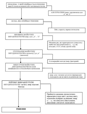 Рис. 4. Блок-схема формування статистичного забезпечення управлінських рішень щодо вдосконалення податкової системи в Україні Основою для формування методичного забезпечення управлінських рішень у податковій сфері виступає сукупність принципів, правил та прийомів, а також методів статистичного дослідження податкової системи. 6.2 Методологія процесу прийняття рішень з використанням статистичних методів 6.2.1 Теорія приймання рішень Рішення - це результат процесу розумової активності, яке приймається в результаті вибору. Рішення ми приймаємо в ситуаціях, коли існує більше ніж одне можливе рішення, а ці рішення відрізняються між собою ефективністю. В зв'язку з вищенаведеним для прийняття рішення вимагається аналіз ситуації вибору. Аналіз ситуації спирається в основному на пошуку відповіді на два питання: I. Чого я хочу досягти? / Що є моєю метою? II. Як досягти мети в існуючих умовах? Аналіз цілей зв'язаний з особистими вподобаннями та потребами. Визначення цілей впливає на обсяг і вибір альтернатив, оскільки власне за допомогою прийнятих рішень цілі повинні бути реалізовані в як найширшому обсязі. Вибір засобів, тобто відповідь на питання, як досягти мети, неможливий без докладного аналізу умов ситуації приймання рішення. Однією з умов ефективності є раціональність дії, що визначається як властивість свідомої (доцільної) дії, яка полягає у пристосуванні засобів до запланованої цілі, а також до умов її здійснення, за допомогою пізнавальних дій і розумування. (Т. Котарбінські) 6.2.2 Опис методології процесу приймання рішень Методи оптимізації в своїх наслідках відносяться до кількісних величин (прибуток, втрата). Не всі, однак, рішення, а особливо рішення органів самоврядування різних рівнів (війт, староста, маршал воєводства) в своїй сентенції відносяться до фінансових ефектів, до яких можна було б застосувати один з методів оптимізації, наприклад, в якому селі в першу чергу треба провести укрупнення ґрунтів (обмежені фінансові засоби, відсутність технічних можливостей виконання), де слід розташувати місцеві очисні споруди, чи зробити дорогу в селі X чи в селі У тощо. Таких дилем на місцях багато. Тому оцінка подібності окремих адміністративних одиниць, на приклад сіл в гміні, гмін в повіті, повітів в воєводстві і їх згрупування (типологія), а потім класифікація за критерієм, наприклад, відстані Евкліда, в найвищій мірі об'єктивна, це основа методології об'єктивного приймання рішень. Процес підтримки рішення не може бути довгим і дорогим. Мусить спиратися на базі даних доступних в ГСУ, воєводстві, повіті чи гміні. Ця умова не створює проблем. В кожній з цих адміністративних одиниць даних на тему: демографії економічних показників, кадастрових даних щодо нерухомого майна - земельних ділянок і будинків, розміру існуючої лінійної інфраструктури, та інших суспільно-економічних показників, потрібних для прийняття в якості параметрів (описуючі перемінні), які характеризують дану адміністративну одиницю, не бракує. Доступ до них не складний, а у більшості ситуацій безкоштовний. Володіння комп'ютерною базою даних і відповідним програмним забезпеченням - це стандарт облаштування адміністрації органів самоврядування, що дозволяє дуже швидко оцінити менші одиниці на місцях, які входять в склад воєводства, повіту чи гміни і впорядкуват