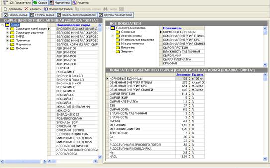 дает возможность расчета рецептов комбикормов, концентратов и премиксов.