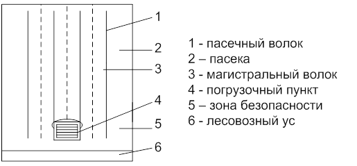 Рисунок 2 Схема разработки пасеки Посередине пасеки располагается волок шириной 5-6м, по обеим сторонам от волока – ленты шириной 3м для складирования заготовленных сортиментов, а по бокам пасек – ленты, свободные от сортиментов. Разработка пасек ведется с подкладочным хлыстом по следующей технологии. Сначала перпендикулярно основному направлению валки производится валка тонкомерного подкладного дерева с таким расчетом, чтобы оно располагалось на расстоянии 5 – 10м спереди от очередной группы деревьев, подлежащих валке, и было приподнято на 50-70см над поверхностью земли. Для этого подкладочное дерево валится на ранее заготовленные сортименты или на микровозвышения, после чего с него обрезаются сучья. Затем на него поочередно валятся деревья из намеченной группы, с которых также обрезаются сучья. Все сучья остаются на месте обрезки или складируются на волоке. Раскряжевка хлыста производится сразу после обрезки сучьев или после перекатывания хлыста на ленту окучивания сортиментов. Таким образом, посередине пасеки образуется вал сучьев, который значительно улучшает проходимость форвардера и предотвращает нарезание колеи. Форвардер проезжает по волоку, уплотняет сучья и образует хорошо укрепленный волок. После транспортировки заготовленных сортиментов пасека остается чистой, но требующей доочистки. Определение оптимальных размеров площади, тяготеющей к погрузочному пункту Оптимальные размеры бригадной делянки рассчитываются на ЭВМ. После расчета на ЭВМ выполняется расчет длины и ширины делянки в соответствии с «Правилами рубок главного пользования в лесах ДВ». Оптимальная площадь: