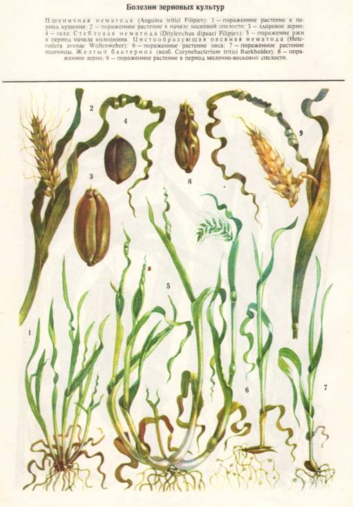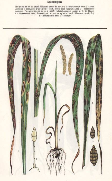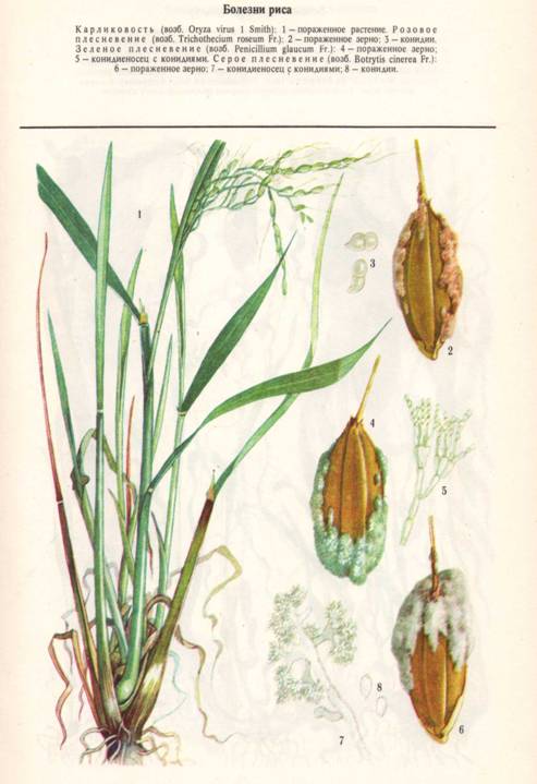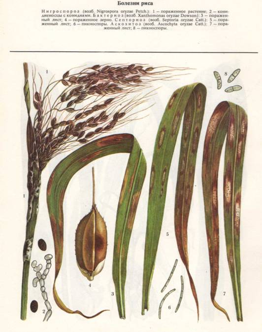 Примечание. В опыте внесены азотные удобрения из расчета: под яровую пшеницу 30, 45 и 60 кг д. в/га, ячмень 30, 60 и 90, овес 0, 30 и 60 кг д. в/га; фосфорные под все культуры - по 30 и 60 кг д. в/га; калийные удобрения - под яровую пшеницу по 30, овес и ячмень по 45 кг д. в/га. 2.1 Защита полевых культур от вредителей и болезней2.1.1 Меры борьбы с болезнями рисаСоблюдение правильного севооборота. Лучшими предшественниками риса являются многолетние бобовые травы, которые в значительной степени уменьшают количество возбудителей болезней риса, находящихся в почве. Заготовка семян со здоровых участков, очистка, калибровка и доведение их до кондиций первого класса. Обязательно увлажненное протравливание семян 1,8-2,3% -ным гранозаном с красителем. Лучшие результаты дает заблаговременное (за 3-4 месяца до посева) протравливание. На 1 т семян при этом расходуют 1,5 кг протравителя и 8,5 л воды. Если же семена приходится протравливать перед посевом, нормы гранозана и воды соответственно составляют 2 кг и 8 л. Раз в три года семена риса можно протравливать также 25% -ным эмульгирующимся концентратом родана (0,23 л/т семян). В предпосевной период планируют поверхность чеков, что имеет большое значение для получения дружных всходов и уменьшения развития корневых гнилей. Для уничтожения сорняков - резерваторов инфекции сразу же после планировки чеков вносят гербицид ялан из расчета 3,6-7,2 кг/га действующего вещества или 6-12 кг/га препарата. При авиаопрыскивании на 1 га расходуют 100 л рабочей жидкости (препарат плюс соответствующее количество воды), а при использовании наземных штанговых опрыскивателей - 400 - 500 л/га. После опрыскивания гербицид заделывается в почву зубовидными боронами на глубину 3-5 см. С этой же целью в предпосевной период при развитии у тростника, рогоза и других сорняков не более 3-5 листьев откосы каналов и другие сооружения ирригационной сети опрыскивают далапоном (20 кг препарата, растворенного в 800-1000 л воды, на 1 га). Сеять рис необходимо в оптимальные сроки, установленные для каждого района возделывания этой культуры, не допуская разрыва во времени между предпосевной обработкой почвы и посевом. Это обеспечивает получение дружных всходов, которые меньше поражаются фузариозом, гельминтоспориозом, пирикуляриозом и другими болезнями. В фазе кущения риса применять авиаобработку посевов амминной солью 2,4-Д из расчета 1,2-1,8 кг действующего вещества (3,5-4,5 кг препарата) на 1 га против клубнекамыша, частухи и других сорняков-резерваторов инфекции пирикуляриоза и подобных болезней. При этом слой воды в чеках не должен превышать 10 см. При нарастании численности тлей, цикад, трипсов, пьявиц и других вредителей, являющихся переносчиками вирусных, бактериальных и прочих болезней, проводят авиаобработку посевов фосфорорганическими инсектицидами: 90% -ным хлорофосом или 20% -ным эмульгирующимся концентратом метафоса из расчета 1 - 1,5 кг/га. Опрыскивать посевы этими препаратами мож-ио не позже чем за 15 дней до уборки урожая. В период вегетации растений, но не ранее чем за 20 дней до уборки урожая, применяют авиаопрыскивание посевов 80% -ным цинебом (5 кг/га) против пирикуляриоза. Если в течение 10 дней после опрыскивания выпадают осадки, опрыскивание повторяют. В настоящее время вместо цинеба для опытно-производственного применения предложен препарат рицид-П, применяемый из расчета 