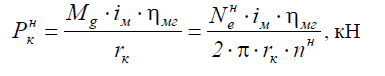 где Pкн– номинальная касательная сила тяги трактора, кН; Мg - номинальный крутящийся момент двигателя, кН.м; Nне - номинальная эффективная мощность двигателя, кВт; iм - общее передаточное число трансмиссии; ηм.г. - КПД трансмиссии и движителя; r к - радиус колеса ведущего, м; nн - номинальная частота вращения коленчатого вала двигателя, 1/мин-1 ηм.г. = ηmц • ηnк • ηr, где ηц, ηк, η r - КПД соответственно пары цилиндрических, конических шестерен и гусеничной цепи; m, n - количество пар цилиндрических и конических шестерен, находящихся в зацеплении при работе на данной передаче (определяется из кинематической схемы трансмиссии трактора). Радиус колеса вычислить с учетом усадки шины по формуле: rк = ro + Кш + hш, где ro - радиус стального обода колеса, м; Кш - коэффициент усадки шины (Кш = 0,75 . . . 0,80) hш - высота шины, м. Для гусеничных тракторов rк равняется радиусу начальной окружности ведущей звездочки. Сила сцепления ходового аппарата трактора с почвой рассчитывается по формуле: Рсц = Gсц • μ, кН где Gсц – сцепной вес трактора, кН μ - коэффициент сцепления ходового аппарата с почвой. Сцепной вес тракторов гусеничных и колесных с двумя ведущими мостами при работе в составе МТА на горизонтальной местности равен весу трактора, а при наличии подъемов (склонов) вычислить по формуле: Gсц = Gтр • cos α, где Gтр - сила тяжести трактора, кН α - угол подъема (спуска), град. У колесных тракторов с одной ведущей осью сцепной вес при движении по склону: Gсц = 32Gтр • cos α, Движущую агрегат силу Рдв для всех вариантов определяют с учетом работы МТА. При достаточном сцеплении движителей трактора с почвой, когда сила сцепления Рсц больше номинальной касательной силы Pкн (Рсц≥Pнк) движущая агрегат сила будет равна номинальной касательной, то есть: Рдв = Pкн При недостаточном сцеплении движителей трактора с почвой, когда сила сцеплении Рсц меньше номинальной касательной силы Pнк (Рсц < Pнк) движущая агрегат сила будет равна силе сцепления трактора, то есть: Рдв = Pсц В этом случае работа трактора в составе МТА не позволяет полностью использовать мощность двигателя. Таким образом, в зависимости от условий работы МТА величины движущей силы трактора находится в пределах: Pнк ≥ Рдв ≤Pсц При недостаточном сцеплении, когда Pсц < Pнк потеря касательной силы тяги ΔРк будет равна: ΔРк = Pкн – Pсц, кН Усилие, затрачиваемое на перекатывание трактора рассчитывается по формуле: Рf = Gтр * fтр * cosα, кН где fтр - коэффициент сопротивления качению трактора. Усилие затрачиваемое на подъем (спуск) трактора Рα определяется по формуле: Рα = ±Gтр • sin α, кН Тяговое усилие трактора определяется из уравнения тягового баланса трактора в составе МТА по формуле: Ркр = Рдв - Рf ± Р α, кН Здесь возможны два варианта расчета усилия на крюке трактора: 1. сцепление ходового аппарата трактора с почвой достаточно (поверхносный слой почвы прочный), т.е. Pсц Pкн и Рдв = Pкн, Pкрн = Pнк - Рf ± Р α, кН 2. сцепление ходового аппарата трактора с почвой недостаточно, в этом случае Pсц < Pкн и Рдв = Pсц, тогда Pкр = Pсц - Рf ± Р α, кН Эффективная мощность двигателя, исходя из условий сцепления ходового аппарата трактора с почвой, может быть определена также по двум вариантам: 1. достаточное сцепление