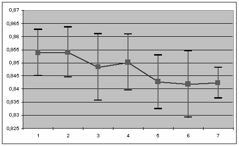 Рис.6 Связь между значениями спектральных индексов NDWI и NDVI для хвойных лесов Московской области по данным MODIS Подтверждением этому предположению могут служить результаты анализа взаимосвязи значений спектральных индексов для хвойных лесов с независимо полученными данными об уровне антропогенной нагрузки на территорию области, сравнение которых в ячейках регулярной сети показало пространственную корреляцию. Дальнейший анализ также продемонстрировал очевидную тенденцию к снижению средних значений обоих спектральных индексов для хвойных лесов по мере роста уровня антропогенной нагрузки на территорию (рис.7).