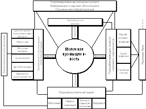 Рис. 4. Схема организационно-производственной структуры и технологических связей овощеплодоконсервного подкомплекса В 2000 г. по сравнению с 1991 г. производство плодоовощных консервов сократилось в 2,6 раза. Мощности предприятий плодоовощной промышленности используются на 10-13 %. Основными причинами такого положения являются: необеспеченность предприятий качественным сырьем и его высокая стоимость; постоянное повышение цен на энергоносители, тарифов на железнодорожные перевозки; неурегулированность платежей между поставщиками сырья, переработчиками и торговыми организациями. Молочнопродуктовый подкомплекс Задача подкомплекса состоит в обечпечении населения страны молоком и продуктами его переработки, без них невозможно обеспечить высокий уровень питания. В состав молочнопродуктового подкомплекса входят: молочное скотоводство, кормопроизводство, первичная обработка молока, переработка молока в промышленных условиях, транспортировка и реализация продукции. По своей структуре молочнопродуктовый подкомплекс состоит из двух основных взаимосвязанных элементов - животноводческих хозяйств и перерабатывающих предприятий, находящихся в непосредственной зависимости от продовольственного рынка страны (спрос на молочную продукцию и ее предложение). Структура и технологические связи подкомплекса показаны на рис. 5.
