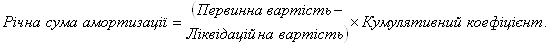 Цей метод забезпечує ще більш швидку амортизацію, чим попередній, уже за 3 роки використання об'єкта його залишкова вартість практично дорівнює ліквідаційній. Кумулятивний метод Кумулятивний метод, або метод суми цифр років, грунтується на розрахунку так званого кумулятивного коефіцієнта, що є по суті, нормою амортизації. При цьому методі річна сума амортизації визначається як добуток вартості, що амортизується і кумулятивного коефіцієнта (пп.4 п.26 ПБО 7)[12]. Розрахунок амортизації здійснюється по формулі: