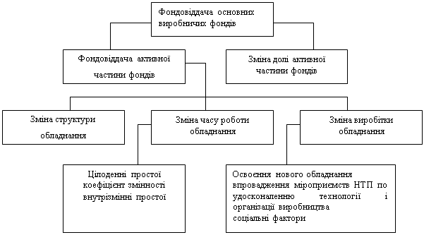 Рис. 5. Схема факторної системи фондовіддачі. Крім того, ефективність використання основних фондів характеризується показниками: продуктивністю одиниці обладнання, коефіцієнтами використання обладнання у часі та потужності, тощо. Вирішальний вплив на фондовіддачу чинить ефективність використання обладнання по часу (екстенсивне) і по потужності (інтенсивне). Час роботи обладнання підрозділяють: - календарне (365 х 24); - режимне (365 – вихідні дні) х тривалість 1 зміни; - планові часи (режимні часи – планові простої); - часи фактичної роботи (планові часи – простої зверх плану). Використання обладнання по часу знаходиться в прямій залежності від коефіцієнта змінності роботи обладнання, який визначається як відношення числа відпрацьованих машинозмін (або станкочасів) до загального числа станків або до найбільшого числа станкочасів, які можуть бути відпрацьовані при однозмінній роботі. Аналізується Кзмін. шляхом порівняння фактично Кзмін. з плановим. Потім визначаються причини змін.Ефективне використання обладнання по потужності характеризується коефіцієнтом ефективності загрузки – визначається відношенням фактичної годинної продуктивності обладнання до планової продуктивності (або нормативної продуктивності). 3.5 Аналіз ефективності використання основних виробничих фондів. Як видно з рис. 5. факторами першого рівня, які впливають на фондовіддачу основних виробничих фондів є: 1) зміна долі активної частини фондів в загальній їх сумі (Дак); 2) зміна фондовіддачі активної частини фондів (Фв.акт) ФВ = Дак х Фв.актРозрахунок впливу факторів виконується способом абсолютних різниць (в розрахунках використані дані таблиці № 3.5.1):ΔФВ = (Дак(ф) - Дак(пл) ) х Фв.акт(пл) = -0,014 х 7,9818 = -0,1117452ΔФВ = (Фв.акт(факт) - Фв.акт(пл)) х Дак(факт) = + 0,155 х 0,754 = + 0,11687Загальний вплив: - 0,11174542 + 0,11687 » + 0,005Позитивно вплинула на фондовіддачу зміна фондовіддачі активної частки фондів (+0,11687), а вплив зменшення долі активної частки фондів (-0,1117452) Тобто за рахунок зміни активної частки фондів в загальній їх сумі фондовіддача зменшилась на –0,1177452, а підвищення фондовіддачі активної частини фондів збільшило показник фондовіддачі на +0,11687. Фондовіддача активної частки фондів (технологічного обладнання) безпосередньо залежить від його структури, часу роботи та середньочасової виробітки. Для аналізу можна використовувати наступну фактичну модель:
