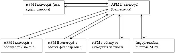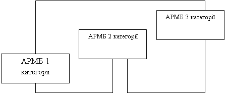 Рис. 6. Організаційна побудова АРМ бухгалтера з обліку основних засобів АРМ 1 категорії з обліку основних засобів встановлюється на робочих місцях виникнення інформації (цехи, відділи). Тут формується первинна інформація з обліку ОЗ, а також проводяться розрахунки на місцях її виникнення. АРМ 2 категорії встановлюються на робочих місцях бухгалтерів, які ведуть облік основних засобів. Формується інформація в цілому на ділянках обліку. Проводиться аналіз показників використання ОЗ, аудит, моделювання та прогнозування облікового процесу. АРМ 3 категорії встановлюються на робочому місці головного бухгалтера, керівника підприємства. Вирішується завдання по управлінню господарською діяльністю підприємства. Тут формується інформація результатів аналізу, прогнозування, моделювання результатів ОЗ. Складається звітність. Модель автоматизованої обробки інформації можна представити таким чином. 1. Підготовка первинної інформації 2. Створення інвентарної картотеки на момент вступу 3. Створення НДІ на момент вступу 4. Створення набору даних руху ОЗ 5. Проведення розрахунків та занесення інформації в БД 6. Формування інформації для наступного використання 7. Проведення аналізу результативної інформації 8. Прийняття управлінських рішень з отриманих результатів 9. Передача даних в суміжні АРМБ. Досягнуті в останні роки результати розвитку засобів обчислювальної техніки, методів проектування програмного та інформаційного забезпечення різного рівня та призначення сприяли суттєвому перегляду прийнятих раніше підходів до створення автоматизованих систем, і перш за все, призвели до створення нової інформаційної технології, основними принципами якої є : 1. Забезпечення спілкування кінцевого користувача (бухгалтера, комірника, економіста і т.п.) з системою автоматизації на професійній мові, представлення вхідної та результативної інформації в звичайній та зручній користувачеві формі. 2. Забезпечення можливості вирішення задач обліку, контролю аналізу та аудиту по їх постановкам та початковим даним незалежно від складності та наявності формальних математичних моделей задач. 3. Створення кінцевому користувачеві таких умов роботи, при яких він здійснює процеси управління та пошук нових рішень в режимі активного розширеного діалогу з ЕОМ, оперуючи поняттями своєї предметної області, використовуючи свій професійний досвід, навички та приймаючи рішення одночасно по множині критеріїв, частина з яких не описана формально та не має кількісного вираження. Для здійснення функціонування об’єкту управління в автоматизованій системі формується інформаційне забезпечення, яке складається з зовнішньомашинних та внутрішньомашинних елементів. В таблиці 5.1. представлена структура інформаційного забезпечення системи автоматизації обліку, контролю та аудиту. Структура інформаційного забезпечення системи автоматизації обліку, контролю та аудиту. Таблиця 5.1.