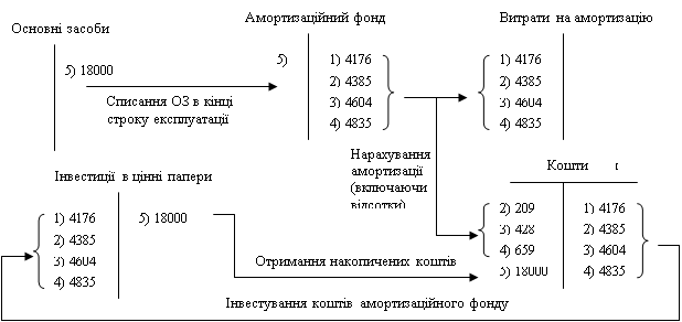 Крім вище наведених методів відображення амортизаційних відрахувань відповідно до МСБО 16, є можливим застосування методу амортизаційного фонду. В умовах застосування методу амортизаційного фонду бухгалтерські записи мають певні особливості (рис. 3.)