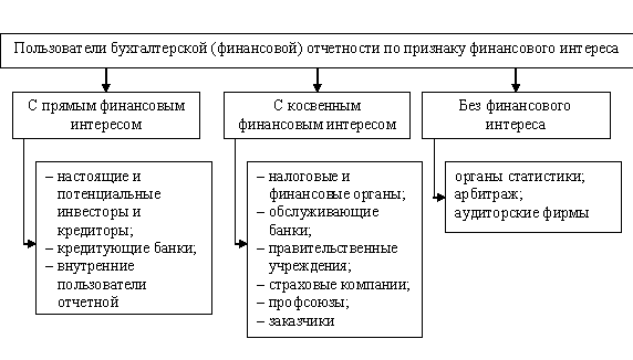 Рисунок 1.1 – Формы бухгалтерской (финансовой) отчетности Числовые показатели в бухгалтерской отчетности приводятся минимум за два года: отчетный и предшествующий. При этом данные должны быть представлены в сопоставимом виде, поэтому при несопоставимых данных за период, предшествующий отчетному, их необходимо корректировать по правилам составления отчетности за отчетный период. Назначением анализа бухгалтерской (финансовой) отчетности с позиции пользователя служат рассмотрение и оценка информации, имеющейся в отчетности, для того чтобы получить достоверные выводы о прошлом и настоящем состоянии организации с целью предвидения ее жизнеспособности в будущем. Необходимо заметить, что для разных пользователей анализ бухгалтерской (финансовой) отчетности с точки масштаба его поведения зависит от конкретно поставленной цели. Таким образом, цели анализа финансовой отчетности зависят от целей, которые ставят перед собой пользователи финансовой информации. На рисунке 1.2 представлена классификация потенциальных пользователей бухгалтерской (финансовой) отчетности по признаку финансового интереса [18].