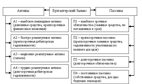 о крайне неудовлетворительной работе организации в отчетном периоде и сложившемся в результате этого плохом финансовом положении (статья «Непокрытый убыток», которая в динамике увеличивается); об определенных недостатках в работе организации, которые могут быть выявлены по данным аналитического учета или приложения к балансу организации для годовой бухгалтерской отчетности (форма № 5): «Дебиторская задолженность долгосрочная», «Кредиторская задолженность долгосрочная». Также следует обратить внимание на статью «Задолженность перед участниками (учредителями) по выплате доходов» в разделе V баланса. Если сумма по этой статье увеличивается и в то же время возрастает сумма по статье «Нераспределенная прибыль», то это может говорить о возникновении трудностей у организации с денежными средствами. Кроме уплотненного баланса, для анализа финансового состояния предприятия рекомендуется составлять сравнительный аналитический баланс, который характеризует как структуру отчетной бухгалтерской формы, так и динамику отдельных ее показателей. Все показатели сравнительного аналитического баланса можно подразделить на три группы: показатели структуры баланса; показатели динамики баланса; показатели структурной динамики баланса. На основе сравнительного аналитического баланса осуществляется анализ структуры активов и пассивов баланса. Структура статей баланса дает общее представление о финансовом состоянии организации, показывают долю каждого вида актива и соотношение заемных и собственных средств, покрывающих их в пассивах. Сопоставляя структуры изменений в активе и пассиве, можно сделать выводы о том, через какие источники в основном был приток новых средств и в какие активы эти новые средства в основном вложены. Здесь необходимо отметить, что для того, чтобы сделать правильные выводы о причинах изменения в структуре активов организации, целесообразно повести детальный анализ разделов и статей актива баланса с привлечением данных формы №5. Задача анализа ликвидности баланса возникает в связи с необходимостью давать оценку кредитоспособности организации, т.е. ее способности своевременно и полностью рассчитываться по всем своим обязательствам. Данный анализ заключается в сравнении средств по активу, сгруппированных по степени убывающей ликвидности, с источниками формирования активов по пассиву, которые группируются по степени срочности погашения (см. рисунок 1.3).