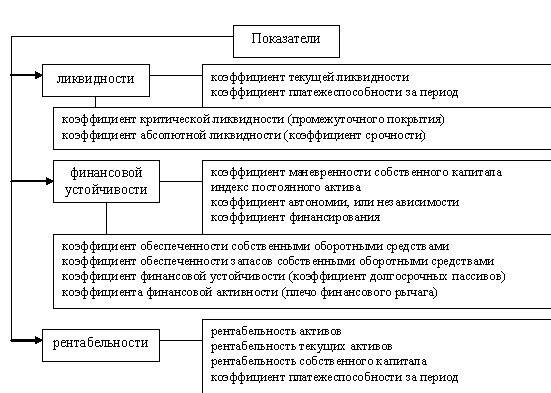 Рисунок 1.3 – Классификация активов и пассивов баланса в целях анализа ликвидности баланса По данным бухгалтерского баланса можно рассчитать показатели ликвидности и показатели финансовой устойчивости (см. рисунок 1.4). Они применяются для оценки способности организации выполнять свои краткосрочные обязательства и характеризуют независимость по каждому элементу активов и по имуществу в целом, дают возможность измерить, достаточно ли устойчива анализируемая организация в финансовом отношении. Также используя данные формы №1 можно рассчитать показатели рентабельности. Отметим, что различные коэффициенты представляют интерес не только для руководителей и финансовых работников организации, но и для различных потребителей аналитической информации. При их расчете следует учитывать специфичность конкретных условий и особенности деловой активности отдельного предприятия. Относительные показатели ликвидности необходимо сравнивать в динамике, со среднеотраслевыми показателями, показателями конкурирующих предприятий.