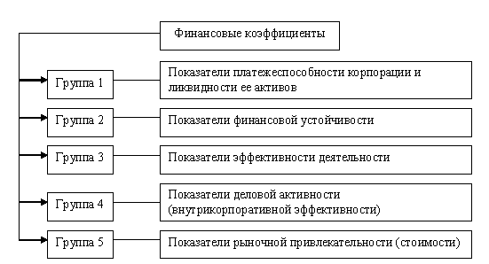 Рисунок 1.5 – Виды финансового анализа на основе формы №4 «Отчет о движении денежных средств» К задачам анализа движения денежных средств относятся: оценка оптимальности объема потоков денежных средств; оценка потоков денежных средств по видам хозяйственной деятельности предприятия; оценка состава, структуры и направлений движения денежных средств; оценка динамики потоков денежных средств; выявление и измерение влияния различных факторов на формирование потоков денежных средств; выявление и оценка резервов улучшения использования денежных средств; разработка предложений по реализации резервов повышения эффективности использования денежных средств. Без проведения анализа движения денежных средств невозможно организовать эффективную систему управления денежными средствами, отсутствие которой может привести к банкротству любое предприятие. В системах управления сложными организационными структурами возрастает значение финансовых методов управления и таких важнейших функций менеджмента, как оценка ресурсного потенциала, стоимости компании, анализа и прогнозирования финансового состояния по данным консолидированной отчетности. Развитие этих функций менеджмента требует уточнения и разработки соответствующих финансовых инструментов и показателей, создания систем аналитического обеспечения процесса управления. Рассмотрим методические аспекты формирования эталонных значений финансовых показателей, что представляет собой следующую ступень в совершенствовании существующих подходов анализа консолидированной отчетности крупных вертикально и горизонтально интегрированных бизнес-структур, позволяют учесть современные тенденции корпоративного строительства организаций (групп) с учетом экономических интересов эффективных собственников (инвесторов), кредиторов, производственного менеджмента и государства. Эти подходы дают реальную возможность более обоснованно анализировать оперативную хозяйственную деятельность любого хозяйственного субъекта, принимая во внимание масштабы деятельности, структуру акционерного капитала и организационно-правовую форму, а также выбранную стратегию развития на перспективу (3-5 лет и более), что в дальнейшем позволит учитывать инновационную составляющую развития [24]. Данный подход к методике анализа финансовой отчетности основан на использовании метода сравнения системы традиционных финансовых коэффициентов и показателей, рассчитанных на базе консолидированной корпоративной отчетности, с эталонными значениями для целей достижения новых конкурентных преимуществ и развития корпоративных образований. Совокупность ключевых финансовых коэффициентов, отражающих тенденции и сравнительную эффективность деятельности корпорации и предназначенных для прогнозирования и моделирования развития, может быть представлена пятью группами, которые объединяют показатели финансового состояния, результатов деятельности и инвестиционной привлекательности (см. рисунок 1.6).
