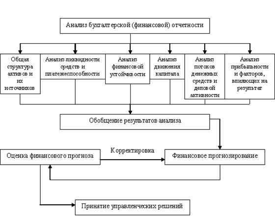 Рисунок 1.2 – Классификация потенциальных пользователей бухгалтерской (финансовой) отчетности по признаку финансового интереса Предмет анализа группы пользователей с прямым финансовым интересом является финансовое положение организации, финансовые результаты ее работы, ликвидность баланса. Группу пользователей с косвенным финансовым интересом интересуют сведения об имущественном положении и платежеспособности предприятия. В частности, финансовым органам и правительственным учреждениям учетная информация необходима для контроля поступлений средств в бюджеты, корректировки финансовой политики через систему налогообложения. Налоговые органы на основании отчетной информации следят за правильностью поступления налогов. Банковские учреждения и страховые компании на основе финансовой информации оценивают возможность заключения договоров с организациями по расчетным операциям и страхованию. Профсоюзы заинтересованы в получении экономической информации об экономической жизнеспособности организации в плане занятости и оплаты труда. Заказчики заинтересованы в информации о перспективах функционирования предприятия. Пользователей группы без финансового интереса отчетная информация интересует с целью проверки правомерности и законности совершаемых операций (арбитраж, аудиторские фирмы) или с целью получения статистической информации (органы статистики) для проведения экономического анализа на макроуровне. Определение целей анализа бухгалтерской (финансовой) отчетности – важная и начальная стадия анализа. Правильно поставленная цель избавляет от ненужной работы. Выбор цели определяет инструменты и методики поведения анализа бухгалтерской (финансовой) отчетности. Цели анализа бухгалтерской (финансовой) отчетности достигаются в результате решения ряда аналитических задач: предварительный обзор бухгалтерской отчетности; характеристика внеоборотных и оборотных активов организации; оценка финансовой устойчивости; анализ ликвидности баланса и его активов; характеристика собственного и заемного капитала; оценка деловой активности; анализ прибыли и рентабельности; разработка мероприятий по улучшению финансово-хозяйственной деятельности организации. Завершающий этап поведения анализа бухгалтерской (финансовой) отчетности для пользователя – оценка (интерпретация) полученных данных и показателей, которая послужит базой для принятия тех или иных управленческих решений или планирования будущих финансовых операций и составления прогнозной бухгалтерской (финансовой) отчетности. Последовательность анализа бухгалтерской (финансовой) отчетности отражена в приложении А. В завершение данного параграфа отметим, что прежде чем анализировать бухгалтерскую отчетность, необходимо убедиться в ее готовности. Для этого проводят ее предварительную проверку: наличие подписей, соблюдение сроков представления в различные органы, соблюдение размерности единиц измерения. 1.2 Стандартные приемы и методы анализа бухгалтерской (финансовой) отчетности Финансовый анализ (анализ по данным финансовой отчетности) в настоящее время является обязательной составляющей финансового менеджмента всякого предприятия и служит [44]: 1) для оценки текущего и дальнейшего финансового состояния предприятия; 2) для определения