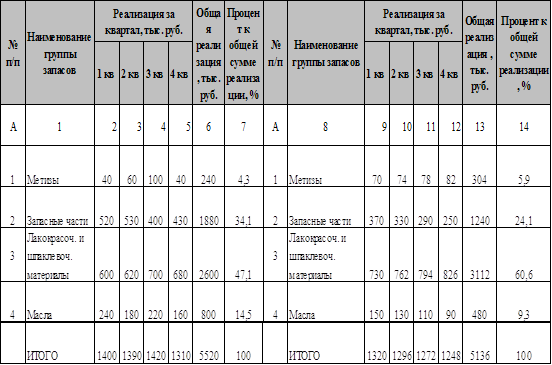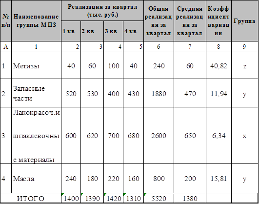 где С целью сокращения на ОАО «КАТОН» РСМУ-10 объема денежных средств, омертвленных в запасах, и усиления контроля за ассортиментом, была проведена дифференциация специально отобранных групп МПЗ с помощью анализа ХУZ. Для этого воспользовались таблицей 3.9. Таблица 3.9 – Поквартальная реализация групп МПЗ на ОАО «КАТОН» РСМУ-10