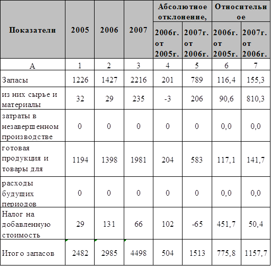 Величина производственных запасов предприятия по данным таблицы имеет тенденцию к увеличению, о чем свидетельствует динамика общей суммы запасов (775,8% в 2006 г., 1157,7% в 2007 г.). Рост уровня запасов обусловлен ростом двух статей запасов – это непосредственно сырье и материалы, и увеличение уровня готовой продукции и товаров, предназначенных для перепродажи. Структуру запасов предприятия нельзя считать оптимальной, поскольку преобладание доли товаров для перепродажи свидетельствует о замедлении товарооборота и как следствие получения выручки. Эффективность использования запасов может быть оценена исходя из скорости их оборачиваемости: · Коэффициент оборачиваемости запасов = = Себестоимость продаж / Средняя величина запасов (3.1) 2005 г. 17513/1227=14,3 дней; 2006 г. 25029/1326,5=18,9 дней; 2007 г. 30367/1821,5=16,7 дней. Данные расчеты говорят об ускорении оборачиваемости запасов (по сравнению с последующими периодами) в 2005 г. на 14,3 дня. Это позволило предприятию высвободить часть запасов, а следовательно и денежные средства, которые были вложены ранее в эти запасы. Замедление оборачиваемости запасов в 2006 г. на 18,9 дней, влечет за собой привлечение дополнительных средств. Анализ обеспеченности запасов собственными источниками финансирования. Соотношение стоимости запасов и величин собственных и земных источников их формирования – один из важнейших факторов устойчивости финансового состояния предприятия. Степень обеспеченности запасов источниками финансирования представлена в таблице 3.2. Таблица 3.2 – Анализ обеспеченности запасов ОАО «КАТОН» РСМУ-10 источниками финансирования в период с 2005 по 2007 гг.