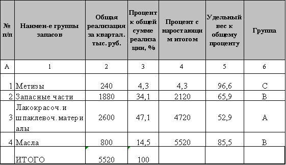 Произведенный АВС-анализ показал, что наиболее значимым для предприятия является группа запасов: лакокрасочные и шпаклевочные материалы, поскольку эта группа занимает большую часть в общем объеме реализации. Воспользовавшись следующей таблицей, продифференцировали товарные запасы по методу АВС.