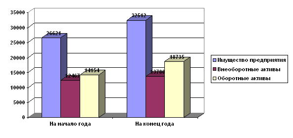 Рис. 1 Динамика основных показателей структуры и имущества предприятия Из данных таблицы видно, что активы предприятия увеличились за отчётный год на 5894 т.руб. Средства в активах распределились следующим образом: основные средства – 11998 т.руб. или 36,9%; незавершённое строительство – 1729 т.руб. или 5,3%; оборотные средства – 18735 руб. или 57,6%. Изменилось органическое строение капитала: на начало года отношение оборотного капитала к основному составляло 1,2, а на конец года – 1,4. Это свидетельствует об ускорении темпов его оборачиваемости, а это может быть свидетелем того, что вложенные в предприятие ресурсы используются эффективно. Важным показателем оценки финансовой устойчивости является темп прироста реальных активов (реально существующих собственного имущества и финансовых вложений по их действительной стоимости). Реальными активами не являются нематериальные активы, износ основных фондов и материалов, использование прибыли, заемные средства. Темп прироста реальных активов характеризует интенсивность наращивания имущества и определяется по формуле: