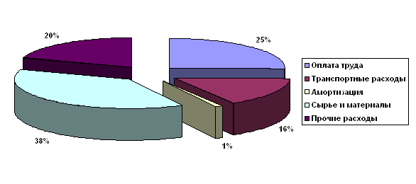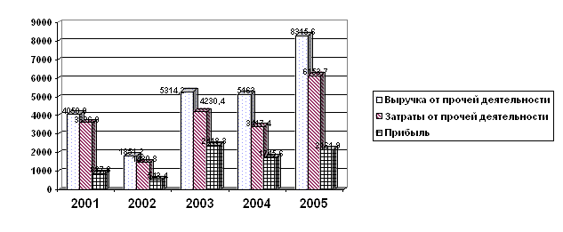 Рис. 3 Данные о некоторых основных фактических показателях деятельности предприятия Из диаграммы следует, что в целом, сумма выручки росла каждый год. Это же относится к сумме затрат и прибыли. Однако следует отметить, что прибыль росла замедленными темпами и, судя по графику, незначительно зависит от выручки. Мы видим, что в 2003 году показатели прибыли были выше с меньшей выручкой и большими затратами, а в 2004 году при более высокой выручке и меньших затратах прибыль оказалась меньше, чем в прошлом году. Посмотрим, какие фактические виды затраты составляют наибольшую долю в общей сумме затрат от прочей деятельности (Рис. 4).