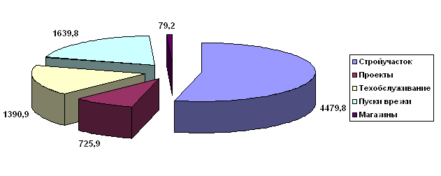 Рис. 4 Виды фактических затрат в общей сумме затрат от прочей деятельности ДЗАО «Тамбовское объединение по газификации» ОАО «Запсибгазпром» за 2005 год Судя по диаграмме, наибольший удельный вес в затратах предприятия составляют расходы на сырье и материалы (около 38%), также велики затрату на оплату труда – в 2005 году на предприятии работало 25 человек. Сумма затрат на транспорт составляет 16%. А вот сумма прочих затрат составляет 20% - сюда входят и отчисления в резервный фонд, начисления, накладные расходы и проч. На рисунке ниже представлены суммы выручек от различной деятельности ДЗАО «Тамбовское объединение по газификации» ОАО «Запсибгазпром» в общем объеме выручки от прочей деятельности. Как видим на диаграмме, наибольшей удельный вес в выручке от прочей деятельности составляет выручка, приносимая Строительным участком – 4479,8 тыс. руб. Значительно меньшую выручку приносит деятельность Пуски Врезки и Техническое обслуживание, их объем соответственно равен – 1639,8 и 1390,9 тыс. руб. Доля проектных работ составляет лишь 725,9 тыс. руб. Как видим, деятельность магазинов совсем незначительна в общем объеме приносимой выручки от прочей деятельности – этот показатель составляет лишь 79,2 тыс. руб.