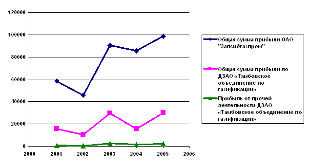 Рис. 5 Виды фактических сумм в фактической выручке от прочей деятельности за 2005 год Структура прибыли ОАО «Запсибгазпром» представлена на рисунке (Рис. 6). Как видим, удельный вес прибыли от прочей деятельности ДЗАО «Тамбовское объединение по газификации» незначителен.