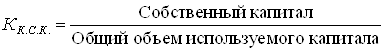 где Ку - коэффициент устойчивости, СК– собственные средства, руб., Имеем: Ку 0 = 9661 + 63/9955 = 1 Ку 1 = 9661+105 / 10664 = 0,9 Таким образом, ДЗАО «Тамбовское объединение по газификации» ОАО «Запсибгазпром» является финансово – устойчивым. Далее проанализируем несколько специфических коэффициентов финансовой устойчивости ДЗАО «Тамбовское объединение по газификации» ОАО «Запсибгазпром». Прежде всего, это коэффициент концентрации привлеченного капитала. Кк.п.к. = 21774 / 32515 = 0,67 Так как доля привлеченного капитала гораздо ниже установленную норму, то предприятие можно считать финансово неустойчивым. Источниками образования собственных средств являются уставной капитал, отчисления от прибыли (в резервный фонд, в фонды социального назначения – фонд накопления и фонд потребления), целевые финансирования и поступления, вклады учредителей и арендные обязательства. Анализ наличия и движения собственных оборотных средств предприятия предполагает определение фактического размера средств и факторов, влияющих на их динамику. Рассчитаем следующий коэффициент – это коэффициент концентрации собственного капитала.