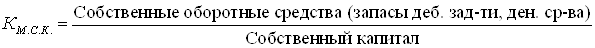 Кк.с.к. = 9661 / 32515 = 0,3 Этот коэффициент ниже установленного показателя и показывает, что концентрация собственного капитала составляет 30%. Для того чтобы охарактеризовать коэффициент маневренности собственного капитала необходимо данный коэффициент рассмотреть в динамике.
