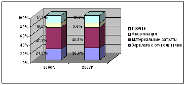 Рис. 3.1 Структура затрат на производство молока Как видно из рис. 3.1, произошел рост по таким элементам как зарплата с отчислениями и прочие затраты, доля же материальных затрат и амортизации снизилась. Наибольший удельный вес в составе материальных затрат на производство молока занимают корма. В данном случае можно говорить о том, что организация находит пути эффективного использования кормов. Поэлементная группировка необходима для того, чтобы изучить материалоемкость, энергоемкость, трудоемкость, фондоемкость и установить влияние технического прогресса на структуру затрат. Если доля заработной платы уменьшается, а доля амортизации увеличивается, то это свидетельствует о повышении технического уровня организации, о росте производительности труда. Удельный вес зарплаты сокращается и в том случае, если увеличивается доля покупных кормов, что свидетельствует о повышении уровня кооперации и специализации хозяйства [24, с. 192]. Анализ проводим на основании формы 13 АПК годовых отчетов за 2006 г. и 2007г. соответственно (см. табл. 3.2, приложения 19, 20). Таблица 3.2 Затраты на производство молока в СПК «Щепичи» за 2006-2007гг.