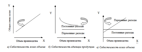 Рис. 3.2 График зависимости себестоимости от объема производства Переменные расходы в себестоимости всего выпуска растут пропорционально изменению объема производства, а в себестоимости единицы продукции они составляют постоянную величину.
