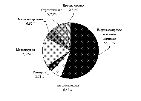 Рисунок 2 - Отраслевая структура потребителей ОАО «Курганхиммаш» Наличие вспомогательных цехов завода позволяет изготавливать товары народного потребления (станки деревообрабатывающие, кухонная мебель, бытовые газовые баллоны и др.), сварочные электроды и стеклоэлектроды. Серийность производимого оборудования – от индивидуальных заказов до серийного производства. Все виды деятельности ОАО «Курганхиммаш» лицензированы ГОСГОРТЕХНАДЗОРом России: - проектирование объектов котлонадзора; - изготовление оборудования химических и других взрывопожароопасных и вредных производств; - изготовление объектов котлонадзора; - монтаж (пуско-наладку) объектов котлонадзора; - эксплуатация объектов котлонадзора; - эксплуатация объектов газового хозяйства; - ремонт (реконструкция) объектов котлонадзора, подъемных сооружений, оборудования для взрывопожаробезопасных, токсичных и агрессивных сред; - экспертиза безопасности объектов котлонадзора; - перевозка опасных грузов железнодорожным транспортом; - подготовка кадров 4 лицензии. Конструирование и изготовление оборудования для сооружений, комплексов, установок с ядерными материалами, предназначенных для производства, переработки, транспортирования ядерного топлива и ядерных материалов лицензированы ГОСАТОМНАДЗОРом России. Уже более сорока лет завод производит оборудование, которое используется практически на каждом промышленном предприятии. В числе деловых партнеров тысячи фирм, расположенных как в России, так и за рубежом. Это Газпром, Лукойл, ЮКОС, Сургутнефтегаз, ТНК, Ярославский шинный завод, Набережно-Челнинский картонно-бумажный комбинат, Байкальский ЦБК, ПО “Красный треугольник”, АКО “Синтез” и другие. Новосибирская, Тюменская, Курганская ТЭЦ, Сургутская, Добрянская, Новочеркасская ГРЭС, Кольская, Запорожская АЭС, Институт ядерной физики, Красноярский алюминиевый завод, “Уралэлектромедь”, «Мечел» Камаз, ЗИЛ, ВАЗ, ГАЗ, Ростсельмаш, автобусные заводы ПАЗ и КАВЗ, Волгоградский тракторный завод, ПО Атоммаш, а также несколько тысяч предприятий России и зарубежья. Основными поставщиками ОАО «Курганхиммаш» являются: металлургические и трубные заводы Череповца, Магнитогорска, Челябинска, Каменск-Уральского; заводы резинотехнических изделий Казани, Ярославля, Екатеринбурга; приборостроительные предприятия Москвы, Орла, Челябинска и другие поставщики. Руководство и ведущие специалисты предприятия постоянно совершенствуют свой профессиональный уровень, используя рекомендации крупнейших консалтинговых фирм мира (Arthur D. Little Inc. и Bain & Company Inc.), что обеспечивает стабильную работу предприятия в современных условиях. Совершенствуя организацию в целом, делаются попытки по созданию достойных условий труда для персонала организации, стимулирующих рост профессионализма. Система качества завода базируется на международных стандартах ISO 9001-94. Высокий технический уровень и качество продукции обеспечивается опытом и традициями, выработанными за многие годы деятельности предприятия, высококвалифицированными кадрами и соответствующим оборудованием. Организационная структура предприятия относится к линейно-функциональному типу, с преобладанием черт, характерных для централизованной организации, т.е. организацией, в которой руководство высшего звена оставляет за собой 