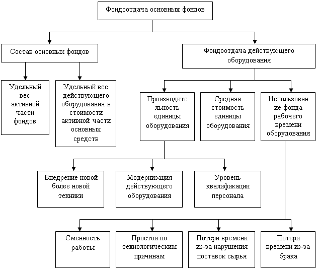где Q - стоимость валовой продукции; F - стоимость основных производственных фондов Совокупность факторов, влияющих на показатель фондоотдачи, и их подчиненность показаны на рисунке 2. Рост фондоотдачи позволяет снижать объем накопления и соответственно увеличивать долю фонда потребления. Следовательно, не меняя общего объема накопляемой части национального дохода, можно повысить долю средства развитие непроизводственной сферы (например, на жилищное строительство, медицинское обслуживание и др.). Повышение фондоотдачи способствует: - улучшению проектирования, сокращению времени разработки технической документации, ускорению строительства и уменьшению сроков освоения вновь вводимых основных фондов, то есть всемерному сокращению цикла ”наука – производство – продукция”; - улучшению структуры основных фондов, повышению удельного веса их активной части до оптимальной величины с установлением рационального соотношения различных видов оборудования; - экстенсивному использованию основных фондов, увеличению коэффициентов сменности, ликвидации простоев оборудования; - интенсификации производственных процессов путем внедрения передовой технологии, повышению скорости работы машин и оборудования, внедрению синхронного выполнения одной машиной двух операций или нескольких, развитию научной организации труда; - улучшению условий и режима труда с учетом производственной эстетики, созданию необходимых социальных условий (жилищных, бытовых, четкой работы транспорта и др.); - сокращению ремонта активной части основных фондов путем специализации и концентрации ремонтного хозяйства; - улучшению материально – технического снабжения основных фондов.