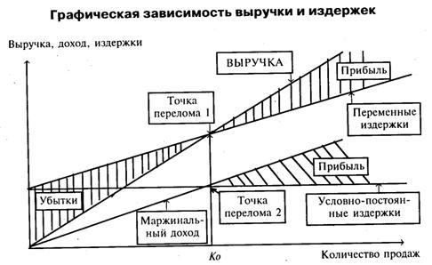 Как видно из таблицы 8 и из предыдущих таблиц в 2001 году увеличились размеры выпускаемой продукции по сравнению с 1999 годом. Возросла также цена продажи продукции. Увеличились объёмы реализации и, соответственно, выручка от реализации. Темпы роста цены реализации яиц опережают темпы роста выпуска яиц. А с птицей и мясом ситуация обратная, т.е. цена реализации растёт медленнее, чем рост объёмов производства и реализации. 3.4. ОПРЕДЕЛЕНИЕ ПОТРЕБНОСТИ В ФИНАНСОВЫХ РЕСУРСАХ ДЛЯ ПРОИЗВОДСТВЕННОЙ ДЕЯТЕЛЬНОСТИДля коммерческих предприятий очень важно определить порог окупаемости затрат, после которого они начнут получать прибыль. Для этого следует установить точку безубыточности. Найти точку безубыточности необходимо для определения объема и стоимости продаж, при которых коммерческое предприятие способно покрыть все свои расходы, не получая прибыль, но и без убытка. Этот метод планирования прибыли базируется на принципе разделения затрат на условно-постоянные и условно-переменные и расчете маржинальной прибыли. Из выручки от реализации продукции (без НДС, акцизов, таможенных пошлин) вычитаются условно-переменные затраты и получается маржинальная прибыль. Далее из маржинальной прибыли вычитаются условно-постоянные расходы и определяется финансовый результат (прибыль или убыток). Точка безубыточности — это такой объем выручки, при котором предприятие не получает ни прибыли, ни убытка. Более наглядно это можно представить графически. Три главные линии показывают зависимость переменных затрат, постоянных затрат и выручки от объема производства. Точка критического объема производства показывает объем производства, при котором величина выручки от реализации равна ее полной себестоимости. Анализ взаимосвязи "затраты — выручка — прибыль" предполагает использование трех элементов • маржинальный доход, • относительный доход, • передаточное отношение, или операционный (производственный) рычаг Маржинальный доход — это разница между выручкой от продаж и переменными затратами на ее производство, т. е. МД=В - ПЕР Относительный доход — это маржинальный доход, выраженный в процентах по отношению к выручке от продаж, т.е. СОД= (МД/В) *100. Передаточное отношение — это отношение маржинального дохода к прибыли от реализации продукции, т.е. ПО = МД/Пр. Таблица 9 Расчёт маржинального и относительного дохода для продукции птицефабрики "Махачкалинская"