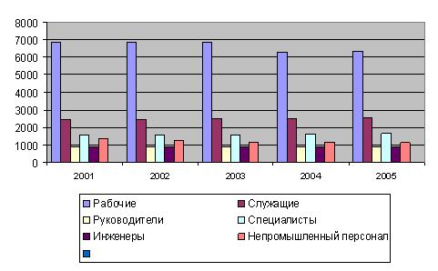 Как видно по данным таблицы 2 за рассматриваемый период улучшились все показатели финансово-хозяйственной деятельности предприятия. 1. Выручка от реализации товаров и услуг увеличилась на 21,1%, прибыль от продаж – на 23,5%. Однако в сопоставимых ценах выручка от реализации продукции увеличилась только на 0,9% 2. Увеличилась стоимость имущества предприятия на 4,7%, в том числе основных фондов – на 9,3%, повысилась также эффективность их использования, что характеризуется увеличением показателя фондоотдачи с 1,05 до 1,16. 3. Как положительный фактор следует отметить увеличение собственного капитала предприятия на 8,6%, при одновременном уменьшении заемного капитала на 15,1%, что свидетельствует о повышении финансовой устойчивости предприятия. 4. Численность работающих за рассматриваемый период уменьшилась на 4,8%., в том числе рабочих – на 7,4% при одновременном росте средней заработной платы на 7,9%, в том числе рабочих – на 13,8%. Производительность труда в сопоставимых ценах увеличилась на 6,0%, в том числе рабочих – на 9,0%, что свидетельствует о снижении эффективности использования трудовых ресурсов на предприятии, так как рост средней заработной платы опережает темпы роста средней заработной платы. 5. Предприятие является платежеспособным, о чем свидетельствует повышение коэффициента текущей ликвидности. 6. Увеличилась рентабельность продаж с 32,7 до 33,4%, рентабельность имущества предприятия с 5,9 до 6,8%, рентабельность собственного капитала – с 7,0 до 7,9%. В целом можно сделать вывод об удовлетворительном финансовом состоянии предприятия. 2.2. Анализ состава и структуры персонала предприятияНа 01.09.2005 года списочная численность работников ОАО «НЗХК» 9990 человек, в том числе 160 – студенты и учащиеся, принятые на период прохождения производственной практики. Изменение численности работников по категориям представлены в приложении 4 и на рис. 1.