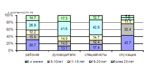 За период с 1998 по 2005 годы в связи с невысоким уровнем текучести кадров и стабильностью кадрового состава, закономерна тенденция к постепенному смещению максимальных значений возрастных групп в сторону увеличения. Подобная картина, последовательного увеличения численности работников в более старших возрастных группах, прослеживается и при рассмотрении возрастного состава по категориям работающих (приложения 6-7). Сокращается удельная численность работников до 40 лет по категориям «руководители», «специалисты», то есть увеличивается средний возраст работников данных категорий (руководители с 46,6 до 47,2 лет, специалисты – с 41,3 до 41,7).