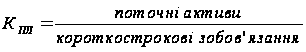 Розрахунок показує, що величина тієї частини короткострокових заборгованостей, яку підприємство може покрити за рахунок наявних грошових коштів і поточних фінансових інвестицій, що можуть бути швидко реалізовані у випадку необхідності, дуже мала. Так на кінець 2004 року коефіцієнт швидкої ліквідності по підприємству менше нормативного (0,04), тобто це означає, що підприємство може погасити лише 0,04% поточної заборгованості за рахунок грошових коштів в національній та іноземній валюті і їх еквівалентах та поточних фінансових інвестицій, на кінець 2006 року значення коефіцієнту зростає і становить 12,05%. 2) Коефіцієнт поточної ліквідності (покриття) показує, яку частку поточних зобов‘язань підприємство може погасити за рахунок наявних у нього коштів [13], розраховується за формулою [54]: