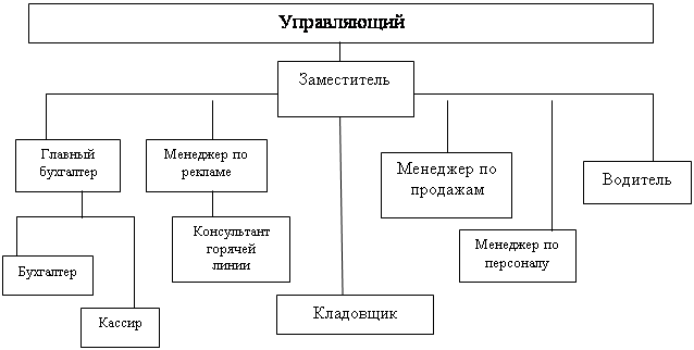 Рис. 7 Организационная структура предприятия Управляющий решает все вопросы деятельности предприятия, без особой на то доверенности действует от имени фирмы, представляет её интересы во всех отечественных предприятиях, фирмах и организациях. Также он распоряжается в пределах предоставленному ему права имуществом, заключает договора, в том числе по найму работников. Издает приказы и распоряжения, обязательные к исполнению всеми работниками организации. Управляющий несет в пределах своих полномочий полную ответственность за деятельность фирмы, обеспечение сохранности товарно-материальных ценностей, денежных средств и другого имущества предприятия. Выдает доверенности, открывает в банках счета, пользуется правом распоряжения средствами. Организационная структура ООО «Во Мэй» линейная. Она имеет ряд достоинств: - четкие системы взаимосвязи между руководителями и подчиненными; - быстрота реакции в ответ на прямые указания; - личная ответственность руководителя за конечные результаты предприятия и другие. К руководителям относятся: управляющий, главный бухгалтер, Заместитель управляющего. Итого – 3 человека. К специалистам относятся: бухгалтер, кассир, менеджеры, консультант горячей линии. Итого – 10 человек. К рабочим относятся: кладовщик (1 человек) и водитель (2 человека). Итого – 3 человека. Преобладающее большинство работников (42%) имеет высшее образование. Средний возраст составляет 32 года. Необходимо отметить, что некоторые функции, такие как аттестация персонала, повышение его квалификации осуществляются не на должном уровне и не регулярно. Оценка персонала осуществляется в основном при приеме на работу, во время собеседований и оценке анкетных данных. Оценка осуществляется, как правило, менеджером по кадрам и является чисто субъективной. Затраты на осуществления функций управления персоналом незначительны, так как все функции реализуются собственными силами, но от этого страдает качественный уровень их выполнения. Все подразделения фирмы находятся в одном здании, что облегчает процесс обмена информацией. Необходимо отметить, что существует определенная текучесть среди линейных руководителей. За предыдущий год сменилось два главных бухгалтера и несколько раз произошла смена заместителя. Это связано с тем, что фирма работает на рынке только два года и еще происходит процесс формирования корпоративной культуры, а также оказывает влияние то, что оплата труда заместителя имеет экономическую привязку к результатам труда. Уровень оплаты труда практически такой же, как и в аналогичных фирмах. На предприятии работает метод косвенного воздействия. Начальник создает условия для осуществления целей, а служащие добивается результатов. Цель организации – удовлетворенность клиентов в качественном продукте, отличном сервисе и при этом получение прибыли. Направления воздействия, применяемые на данном предприятии: - экономический метод управления, когда существует материальная заинтересованность менеджеров. Менеджер применяет различные методы для достижения результативности, экономический метод при этом является самым эффективным, так как существует прямая зависимость: чем больше продукции продал, тем больше получил прибыли. Оплата труда этих специалистов строится по простой схеме: оклад + процент от прод