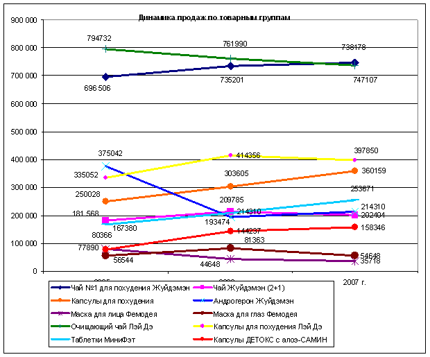 Рис. 8 Динамика продаж по товарным группам В структуре реализованной продукции в 2005 г., в 2006 г. и в 2007 г. основное место занимал Очищающий чай Лэй Дэ соответственно 26,36 %, 24,56% и 23,34 %, в 2007 г. доля Лэй Дэ упала в связи с тем, что удачно проведенная рекламная кампания капсул для похудения Лэй Дэ и капсул ДЕТОКС с алоэ-САМИН существенно повысила долю продаж данных товаров с 11,11 % до 12,58% и с 2,58% до 5,01 % соответственно для каждого наименования. Также немного отстает от показателей чая Лэй Дэ чай №1 для похудения Жуйдэмэн: 23,1% - в 2005 г., 23,69% - в 2006 г. и 23,63% в 2007 г. Как видно из таблицы 2.3. и рисунка 2.2. продажа этого чая в основном стабильна по годам, но в 2007 г. удельный вес продаж в общем объеме снизился на 0,03%. 2.2 Анализ динамики и структуры товарооборота предприятия ООО «Во Мэй» Развитие товарооборота определяет широту и глубину проникновения предприятия на потребительский рынок и его конкурентную позицию на этом рынке, общие возможности и темпы экономического развития предприятия в стратегической перспективе. Показатели товарооборота имеют высокую степень связи с другими важнейшими показателями деятельности торгового предприятия. В системе этих связей наибольшую роль играют следующие их формы: 1) внутренняя связь отдельных показателей товарооборота; 2) связь товарооборота с показателями объема ресурсного потенциала и эффективности его использования; 3) связь товарооборота с суммой и уровнем важнейших финансовых показателей. Связь товарооборота с показателями объема ресурсного потенциала и эффективности его использования рассматривается обычно в разрезе отдельных видов используемых ресурсов. В таблице 5 представлены данные за 2006-2007 гг. для анализа товарооборота. Таблица 5 Данные о движении товаров на предприятии ООО «Во Мэй» на 2006-2007 гг.