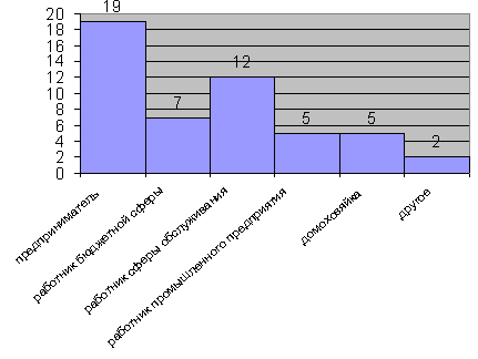 Рис. 10 Распределение покупателей по роду занятий Проведенный анализ позволяет определить целевую аудиторию будущей рекламной кампании – женщина-предприниматель среднего возраста – 40-45 лет. При изготовлении наружной рекламы, рекламных роликов и листовок необходимо учитывать этот фактор – для кого данная реклама предназначена.