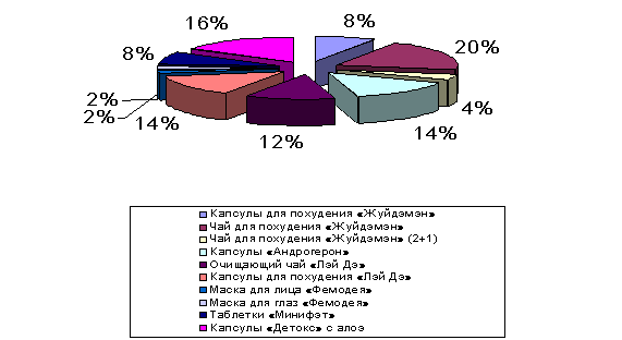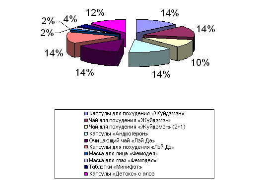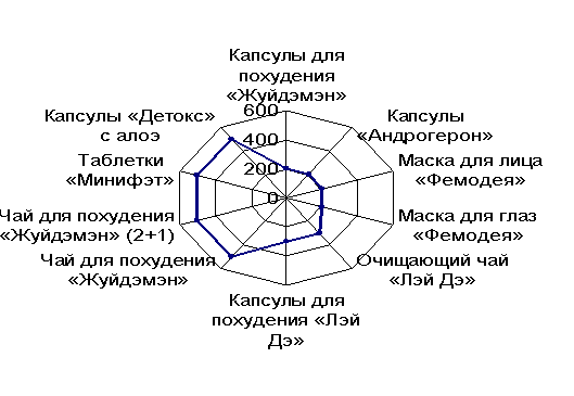 Рис. 12 Распределение доли известности продукции Данный результат анкетирования позволяет сделать вывод о том, какая продукция недостаточно известна и восстановить пробелы в маркетинговой политике предприятия. Практически малоизвестны маски «Фемодея» и таблетки «Минифэт». Следует пересмотреть маркетинговую политику по данным видам продукции. На рис. 13 представлена диаграмма конкурентоспособности по цене. Данная диаграмма иллюстрирует отношение покупателей к продукции, насколько они оценивают реальную полезность каждого продукта компании, сколько покупатель согласен в среднем платить за продукцию компании. Данные сведения могут быть полезны при планировании розничной цены на продукцию, если компания решит открыть розничные фирменные киоски.