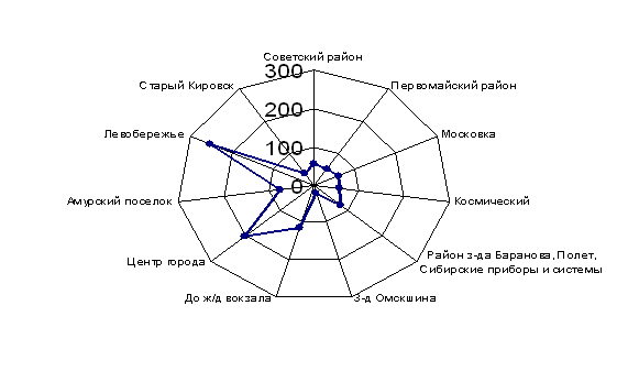 Рис.13 Диаграмма конкурентоспособности товара по цене Диаграмма конкурентоспособности по цене, изображенной на рис. 14 показывает, что наиболее конкурентоспособной по цене продукцией являются чаи и капсулы для похудения и очищения организма «Жуйдэмэн» и «Минифэт». Менее конкурентоспособными являются продукты «Андрогерон» и «Лэй Дэ». Чтобы повысить конкурентоспособности данной продукции, следует также обратить внимание на маркетинговую политику предприятия в отношении данной продукции, а также сообщить о результатах исследования на предприятие-изготовитель. Следующим шагом исследований станет выяснение очагов спроса на продукцию фирмы «Во Мэй» по округам города и возможность открыть сеть розничных точек по продаже продукции «Во Мэй». Для этого проведем обработку всех анкет и выясним, в каких округах города торговля продукцией идет наиболее интенсивно. Данные отобразим в таблице 13 и на рис.14. Таблица 13 Распределение спроса по округам г. Омска