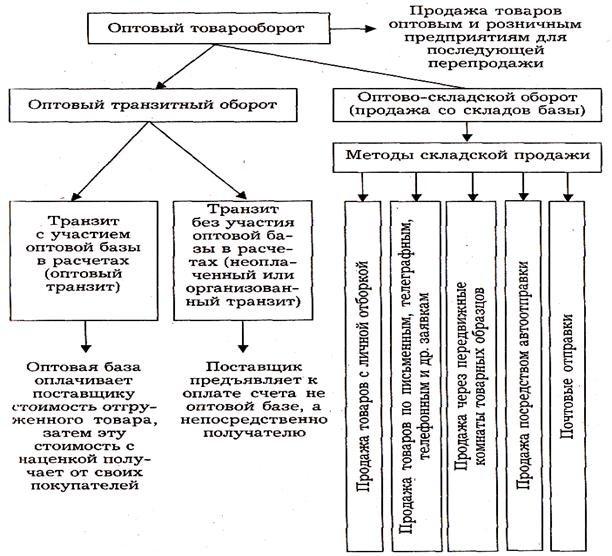 Рис. 5 Схема движения товаров при оптовом товарообороте При оптовом складском обороте применяются следующие методы оптовой продажи товаров со складов: по личной отборке товаров покупателями; по письменным, телефонным, телеграфным, телетайпным, телефаксным заявкам (заказам); через разъездных товароведов (коммивояжеров) и передвижные комнаты товарных образцов; через автосклады; почтовыми посылками. Продажа товаров с личной отборкой практикуется, как правило, по изделиям сложного ассортимента (ткани, швейные изделия, трикотаж, галантерея и др.), когда выбор фасонов, рисунков, расцветок требует участия (ознакомления) представителя кооператива или магазина. Для создания удобств покупателям в отборе товаров оптовые базы потребительской кооперации организуют оптовую продажу товаров через залы товарных образцов. Зал товарных образцов – это коммерческий центр современной базы. В нем сосредоточена основная работа, связанная с организацией продажи товаров: ознакомление покупателей образцами товаров, имеющихся на складах, а также с новыми товарами, оформление соответствующей документации на продажу в оперативный учет товаров. Здесь выделены рабочие места товароведов с необходимой организационно-технологической оснасткой. В залах товарных образцов размещаются также рабочие места товароведов-реализаторов и фактуристов, которые в зависимости от специализации складов формируются в соответствующие отделы и группы. Товаровед-реализатор вместе с представителем покупателя на основе ознакомления с товарными образцами и отбора покупателем товаров оформляет в трех экземплярах заказ (отборочный лист) на отборку товаров на складе, который они оба и подписывают. Один экземпляр заказа передается покупателю для контроля, другой для выписки счета-фактуры, третий на склад для индивидуальной отборки и подготовки товаров к отпуску. Для учета движения товаров товароведы-реализаторы заполняют карточки количественно суммового учета, которые сводятся в картотеки для каждой товарной группы. Продажа товаров по письменным, телеграфным и телефонным заявкам без предварительной личной отборки осуществляется по товарам простого ассортимента или хорошо известным товарам сложного ассортимента. Заявки, поступающие на базу по почте или телефону, регистрируют в специальном журнале, проверяют с точки зрения соответствия заключенному договору и передают на исполнение. Рекомендуется составлять заявки на бланках установленной формы, изготовленных типографским способом и разосланных покупателям. Отдельные оптовые базы организуют через почтовые отделения связи отправку населению или магазинам посылок с различными непродовольственными товарами. Эта форма торговли осуществляется по специальным каталогам, в которых дается характеристика (описание) отправляемых посылками товаров, а также условия их оплаты и порядок заказа. Отправка посылок с товарами непосредственно населению называется индивидуальной или розничной посылочной торговлей, магазинам мелкооптовой посылочной торговлей. Индивидуальная посылочная торговля имеет большие перспективы для своего развития, особенно для обслуживания жителей малых сел и отдаленных населенных пунктов, где отсутствует стационарная розничная торговая сеть. Оптовые базы могут применять и другие 