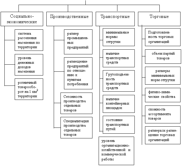 Рис. 1 Схема формирования затрат на товародвижение Обеспечение минимальных трудовых, материальных и финансовых ресурсов и сокращение времени обращения товаров соответствуют требованиям рационального хозяйствования - достижению наилучших результатов при наименьших затратах. Это условие может быть достигнуто за счет использования рациональных схем движения товаров, различных видов транспорта, обеспечивающих эффективность транспортировки товаров, экономического обоснования размещения материально-технической базы на всем пути продвижения товаров от производственных предприятий к потребителям, партий и частоты завоза. Принятие экономически обоснованных решений должно обеспечить оптимизацию совокупных затрат, связанных непосредственно с перемещением и нахождением товаров в сфере обращения и в процессе их реализации.