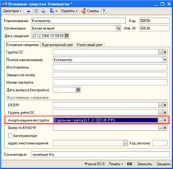 Рис. 2 Рассмотрим подробнее порядок начисления амортизации нелинейным и линейным методами, а также особенности их отражения в программе. Нелинейный метод амортизации Итак, с учетом новаций налогового законодательства с 2009 года нелинейный метод начисления амортизации применяется в следующем порядке: амортизация начисляется по каждой амортизационной группе (а не по каждому объекту амортизируемого имущества); если налогоплательщик в соответствии со статьей 259.3 НК РФ применяет повышающие/понижающие коэффициенты, в рамках группы должны быть выделены отдельные подгруппы. Например: амортизационная группа VI, коэффициент 1; амортизационная группа VI, коэффициент 2; для начисления амортизации по группе необходимо сформировать суммарный баланс. Под суммарным балансом понимается первоначальная стоимость всех амортизируемых объектов, входящих в группу/подгруппу (за исключением тех, по которым амортизация исчисляется исключительно линейным методом) за минусом накопленной амортизации (п. 2, п. 4 ст. 259.2 НК РФ); при принятии объекта к учету его первоначальная стоимость увеличивает суммарный баланс соответствующей группы (подгруппы), при выбытии - уменьшает на остаточную стоимость (п. 3, п. 10 ст. 259.2 НК РФ); сумма амортизации по группе/подгруппе определяется как произведение суммарного баланса по группе/подгруппе и нормы амортизации (п. 1 ст. 322 НК РФ). При этом норма амортизации применяется с учетом повышающего/понижающего коэффициента (см. формулу). Сумма амортизации по группе (подгруппе) = Суммарный баланс группы (подгруппы) х (Норма* х Коэффициент) Примечание:* Нормы амортизации для каждой группы установлены в НК РФ (п. 1 ст. 322, п. 5 ст. 259, п. 9 ст. 257 НК РФ) Хочется обратить внимание на следующий принципиальный момент. Как указано выше, НК РФ с 1 января 2009 года не требует вести пообъектный учет амортизации при применении нелинейного метода. Тем не менее, учет в программе "1С:Бухгалтерия 8" по-прежнему ведется по каждому объекту, а не по амортизационным группам/подгруппам. Это обусловлено рядом причин: постоянные и временные разницы удобнее рассчитывать по каждому объекту; контроль за начислением амортизации удобнее также осуществлять по каждому объекту. Для получения сводных данных по амортизационным в программе специально создан отчет Регистр-расчет амортизации нелинейным методом (см. рис. 3).