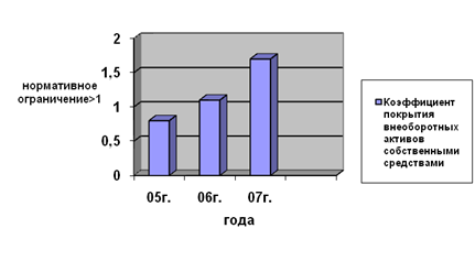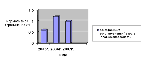 Рисунок 11. Динамика изменения коэффициента восстановления (утраты) платежеспособности за 6 (3) месяцев. Как показывают данные таблицы 4 и рисунков 8,9,10 и 11 за три года коэффициент абсолютной ликвидности возрос и соответствует нормативному значению > 0,2-0,3 ( в 2005 году коэффициент был равен 0,1, в 2006- 0,3, а в 2007 уже 0,7), так же увеличился и коэффициент критической ликвидности (в 2005 году он составлял 0,6, в 2006- 1,1, в 2007- 1,5 при нормативе >07-1).Динамика увеличения говорит о возможности расплатится активами по своим обязательством. Коэффициент покрытия или текущей ликвидности находится в пределах нормы > 1-2 и равен 2, но по сравнению с предъидущем годом он снизился (на 0,3), следовательно, понизился и коэффициент восстановления (утраты) платежеспособности, но он так же входит в рамки нормативных ограничений > 1 и равен 1. Таким образом, можно сказать, что ОАО «НКМК» не утратит своей платежеспособности в ближайшие 3 месяца, но динамика снижение коэффициентов по сравнению с 2006 годом требует разработки мероприятий по укреплению платежеспособности. 2.6 Анализ ликвидности баланса Ликвидность баланса определяется как степень покрытия обязательств организации активами, срок превращения которых в деньги соответствует сроку погашения обязательств. Анализ ликвидности баланса заключается в сравнении активов сгруппированных по степени их ликвидности с пассивами, сгруппированными по степени срочности погашения обязательств. Наиболее мобильной частью ликвидных средств являются деньги и краткосрочные финансовые вложения. Ко второй группе относятся готовая продукция, товары, отгруженные и дебиторская задолженность. Ликвидность этой группы текущих активов зависит от своевременности отгрузки продукции, оформления банковских документов, скорости платежного документооборота в банках, от спроса на продукцию, ее конкурентоспособности, платежеспособности покупателей, форм расчетов и др. Задача анализа ликвидности баланса возникает в связи с необходимостью давать оценку кредитоспособности организации, то есть способности своевременно и полностью рассчитываться по всем своим обязательствам. Анализ показателей ликвидности баланса представлен в таблице 5. Таблица 5