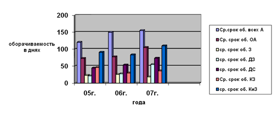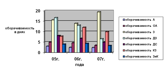 Как показывают данные таблицы 6 за 2007 год активы организации растут быстрее чем выручка, а темп прироста прибыли отрицательный, значит затраты на производство продукции возрастают, отсутствует эффективное использование ресурсов и расширение производства. При сопоставлении темпов роста «золотое правило экономики» не соблюдается (2006 год- чистая прибыль >выручки от продаж< темпа роста активов>100%, 2007 год чистая прибыль <выручки от продаж< темпа роста активов>100%), следовательно нужно изменить подходы к управлению ресурсами на ОАО «НКМК». 2.8 Анализ показателей оборачиваемости Для принятия обоснованных управленческих решений важна подлинная динамика хозяйственной жизни предприятия, которая может быть раскрыта с помощью показателей оборачиваемости. Оборачиваемость - это показатель, демонстрирующий объем (масштабы) изменения (движения) актива или пассива в целом, либо конкретных статей актива и пассива за определенный период. Показатель оборачиваемости рассчитывается на основе учетных данных путем деления оборота по счету на среднее значение его сальдо. Понятие "оборачиваемость" подразумевает выбытие активов и погашение пассивных обязательств, показатель оборачиваемости товаров говорит о том, сколько раз за отчетный период предприятие продает объем товарных запасов, продемонстрированный в активе баланса, оборачиваемость товаров в смысле динамики этой статьи актива выражается не только объемом продаж, но и объемом поступлений товаров [8, c.396]. Анализ показателей оборачиваемости предоставлен в таблице 7 и рисунке 12. Таблица 7