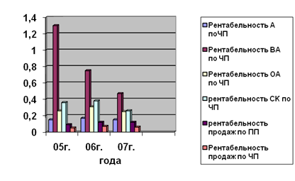 Рисунок 15. Динамика изменения показателей оборачиваемости. Как показывают данные таблицы 7 и рисунков 13,14 и 15 выросли средний срок оборота всех активов (в 2005 году он составлял 120 дней, в 2006- 150 дней, в 2007- 155 дней), средний срок оборота оборотных активов (2005 год 73 дня, 2006- 77 дней, 2007- 105 дней), средний срок оборота денежных средств (2005год- 44 дня, 2006- 53 и 2007- 74 дня), средний срок оборота дебиторской задолженности (в 2005 год он составлял 21 день, в 2006- 27 дней, в 2007- 55 дней), уменьшились средний срок оборота запасов (по сравнению с 2005 годом на 5 дней) и средний срок кредиторской задолженности (на 10 дней). Операционный и финансовый циклы увеличились (на 29 и 35 дней соответственно), что говорит о спаде деловой активности. Увеличение оборота дебиторской задолженности и денежных средств указывает на затруднение расчетов с дебиторами, а увеличение оборота активов на их неэффективное использование. Таким образом деньги вложенные в активы, превращаются в реальные деньги очень медленно, что отрицательно влияет на финансовое положение предприятия. ОАО «НКМК» следует пересмотреть подходы к использованию своих активов и усилить работу с дебиторами организации. 2.9 Анализ показателей рентабельности Рентабельность представляет собой доходность (прибыльность) производственно-торгового процесса. Ее величина измеряется уровнем рентабельности. Если предприятие получает прибыль, оно считается рентабельным. Показатели рентабельности, применяемые в экономических расчетах, характеризуют относительную прибыльность. Прибыль – это денежное выражение основной части денежных накоплений, создаваемых предприятиями любой формы собственности. Как экономическая категория, она характеризует финансовый результат предпринимательской деятельности и является показателем, который наиболее полно отражает эффективность производства, объем и качество производственной продукции, состояние производительности труда, уровень себестоимости [8,c.415] Показатели рентабельности характеризуют эффективность работы предприятия в целом, доходность различных направлений деятельности (производственной, предпринимательской, инвестиционной), окупаемость затрат и т.д. Они более полно, чем прибыль характеризуют окончательные результаты хозяйствования, потому что их величина показывает соотношение эффекта с наличными или использованными ресурсами. Их применяют для оценки деятельности предприятия и как инструмент инвестиционной политики и ценообразования. Анализ показателей рентабельности ОАО «НКМК» представлены в таблице 8 и на рисунке 16. Таблица 8