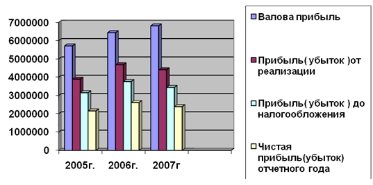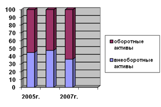 Рисунок 1 Сравнительная диаграмма изменения финансовых результатов по годам. Как показывают данные таблицы 1 за последние три года возросла доля валовой прибыли (темп прироста составил в 2006 год 12,7%, в 2007 году 5,8%), так же возросли управленческие расходы ( 2006год на 0,5%, 2007 год на 10,6%) и коммерческие расходы (в среднем на 116,2%), уменьшились выручка ( в 2006 году на 12,7%, а 2007 по сравнению с 2005 на 11,6%), доходы и расходы от прочей деятельности (соответственно 2006 год на 17,3 и 19,3%, 2007год на 96,5 и 89,3%). Прибыль от реализации услуг в 2007 году меньше чем в предъидущем на 5,8%, но наблюдается позитивная динамика роста, в сравнении с 2005 годом, прибыль увеличилась на 14,4%. За анализируемый период прибыльной была основная деятельность организации, доля прочих доходов снизилась почти на 100%.В результате снижения себестоимости услуг повысились прибыль от реализации и валовая прибыль, но за счет значительного увеличения расходов и уменьшения доходов от прочей деятельности выручка снизилась в среднем на 10%. Для стабилизации положения следует уменьшить управленческие расходы и держать себестоимость реализованных услуг на прежнем уровне. 2.3 Анализ состава и структуры баланса Анализ состава и структуры баланса проводится с помощью вертикального и горизонтального анализов финансовой отчетности. Горизонтальный анализ заключается в построении одной или нескольких аналитических таблиц, с помощью которых абсолютные балансовые показатели дополняются относительными темпами роста(снижения) за несколько периодов. Цель горизонтального анализа состоит в том, чтобы выявить абсолютные и относительные изменения величин различных статей финансовой отчетности за определенный период, дать оценку этим изменениям. При горизонтальном анализе баланса сопоставляются статьи баланса, исчисляемые по ним показатели на начало и конец одного или нескольких отчетных периодов. Вертикальный анализ выполняют путем процентного отношения каждой статьи к итогу баланса. Цель такого анализа заключается в расчете удельного веса отдельных статей в итоге баланса и их оценке их динамики для возможности выявления и прогнозирования изменений активов и источников их покрытия, а так же в выявлении изменения величин статей финансовой отчетности за определенный период [14, c97] Анализ состава и структуры баланса представлен в таблице 2 и на рисунках 2 и 3. Таблица 2